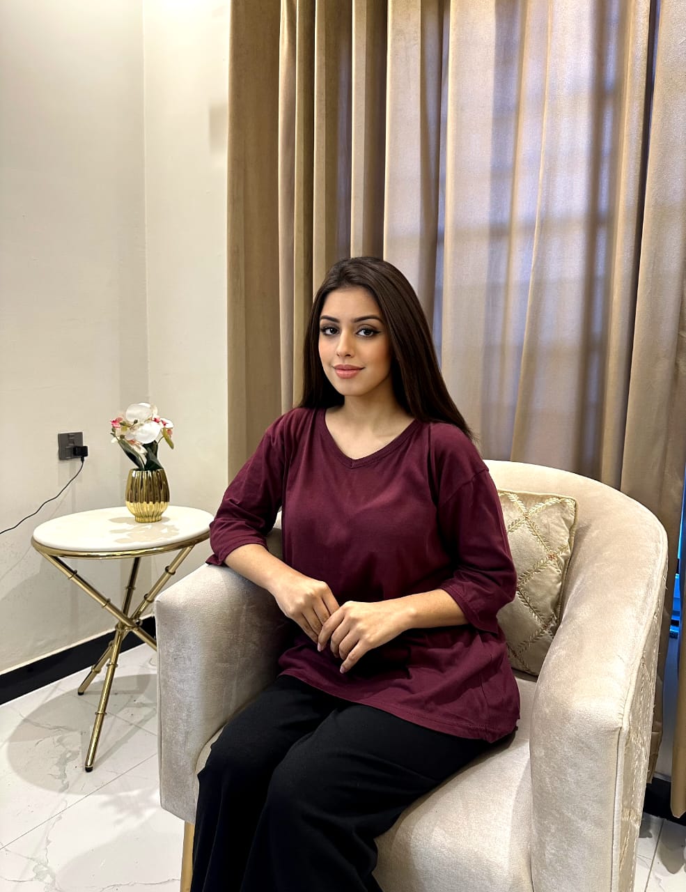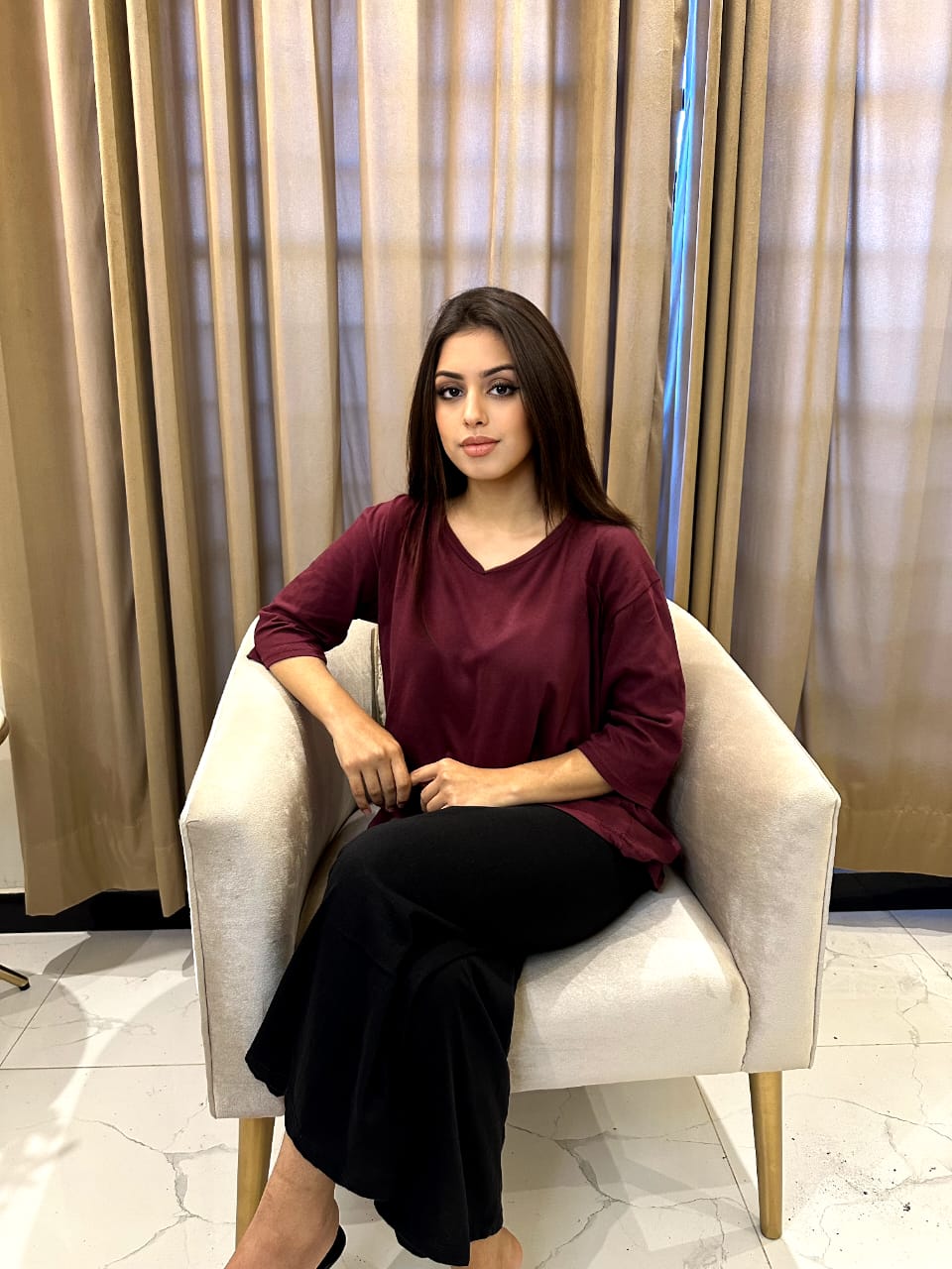 Plain Red V Neck T Shirt with Black Plazzo